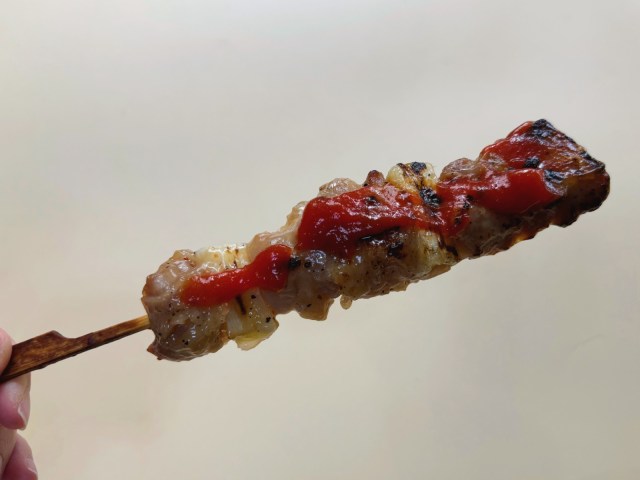では、さっそく「焼き鳥」にかけて食べてみましょう! スーパーで買ってきた塩味のねぎまにサンバルアスリを塗っていただてみると……おおぉ、これはビジュアル・味ともに、インドネシアの串焼き料理のサテそっくり!!!