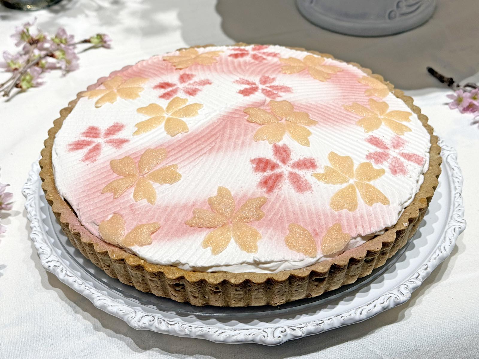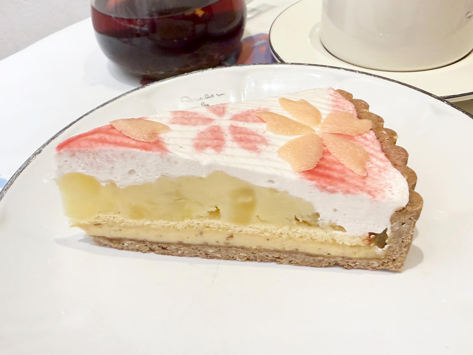 胡麻を加えたプチプチとした食感のタルトに、香ばしい白ごまのクレームブリュレ。た〜っぷりとのせられたさつまいものミルク煮の上には、春の桜が舞い散る水紋がクリームで描き出されています。