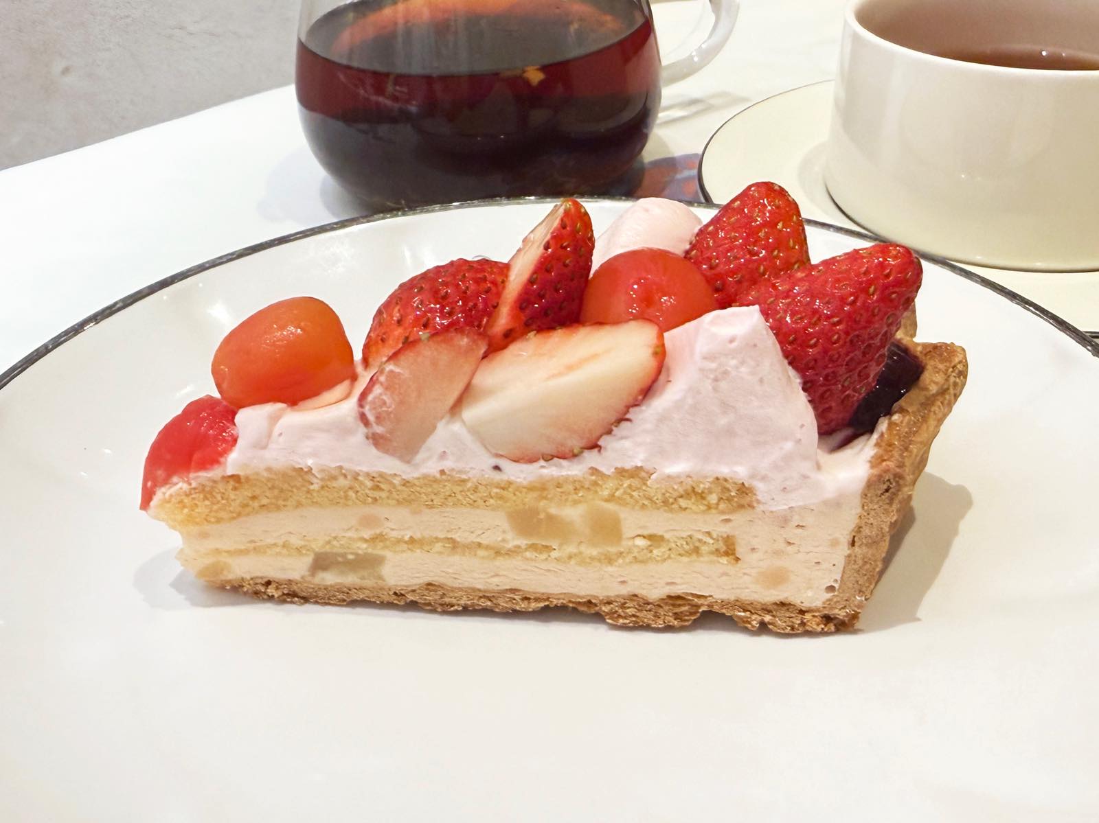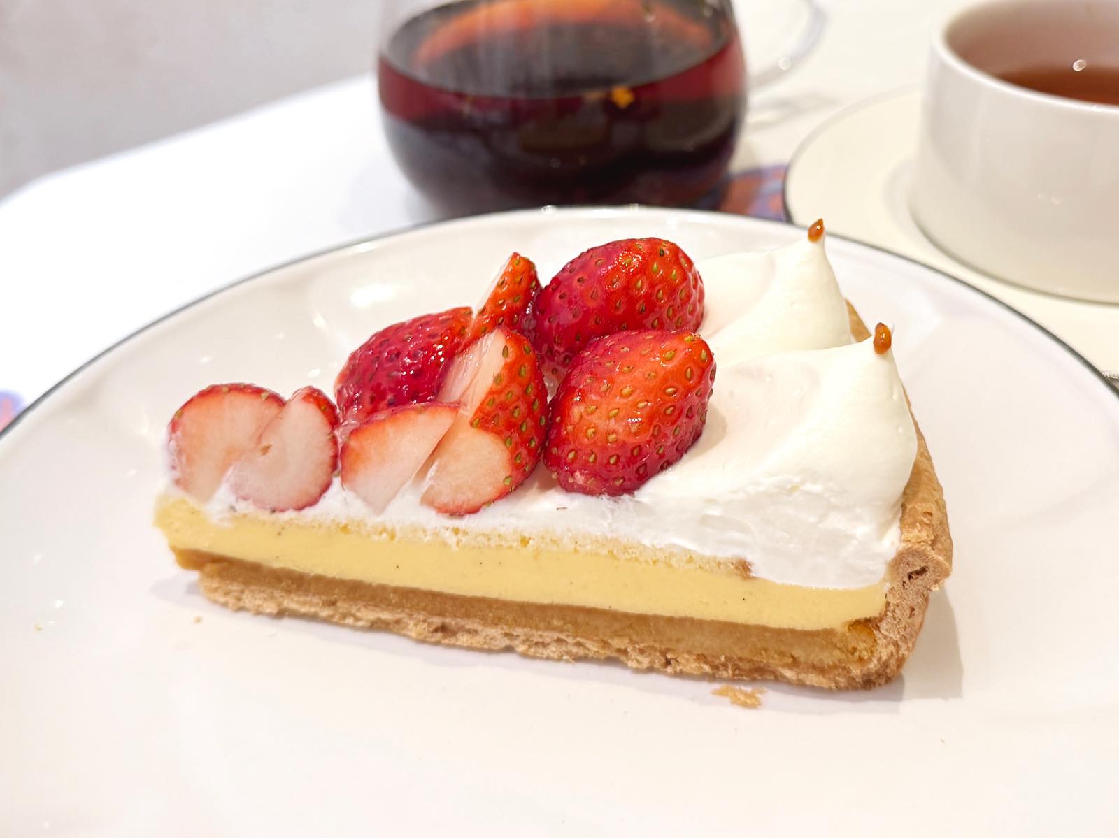 プリンのむちっとした甘さと食感にクリーム、いちごと、まさにプリンアラモードな味わい。お酒が使用されていないので、年齢を問わず幅広く楽しめるのもうれしい。王道の甘さ、おいしさを楽しめるタルトでした。