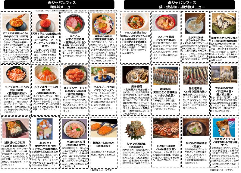 旬の魚介をたっぷり盛りつけた海鮮丼、全国各地に伝わる漁師飯や郷土料理、鍋・焼き物・揚げ物・ラーメン・ピザなど、多種多様なメニューが勢ぞろい。いまここでしか味わえない料理も並ぶといいます。