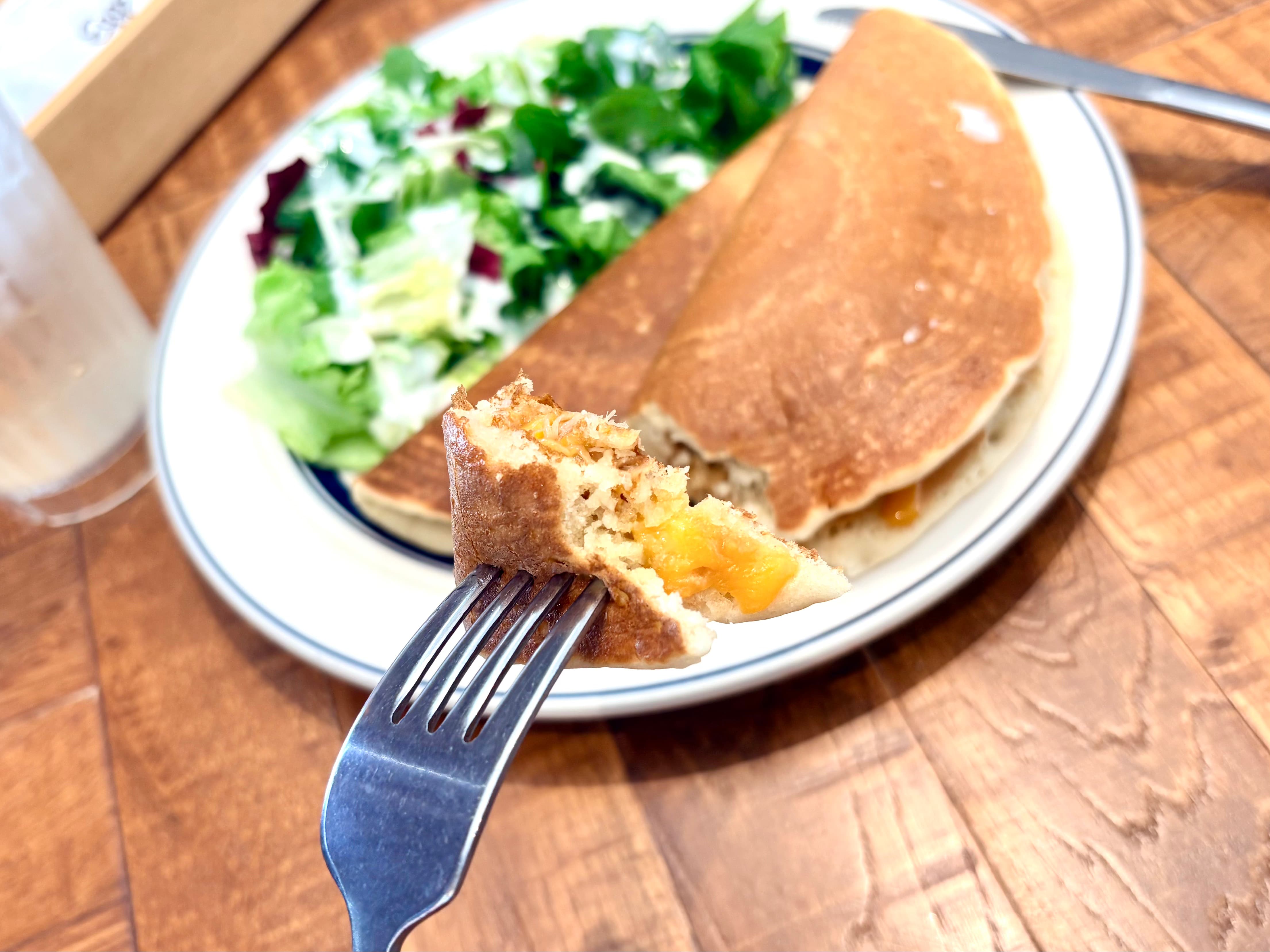 さっそく主役のパンドイッチからいただくと、ふかふかでほのかに甘いパンケーキに、しっとり柔らかくて程よい塩気のカルアポーク、さらに濃厚なチーズがよく合うこと!