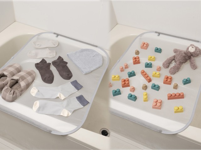 そこで注意したいのが、平らな状態で干せる環境を作ること。浴槽の上に置ける平干しネットなら、水滴を気にせず干せて、洗ったぬいぐるみや小物類の乾燥にも便利です!