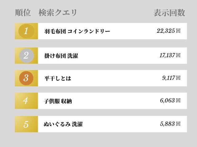 ダイヤのコーポレートサイトに掲載されている家庭用品コラム。その検索傾向を見てみると、多い順から「羽毛布団 コインランドリー」「掛け布団 洗濯」「平干しとは」「子ども服 収納」「ぬいぐるみ 洗濯」となっていることがわかったそう。