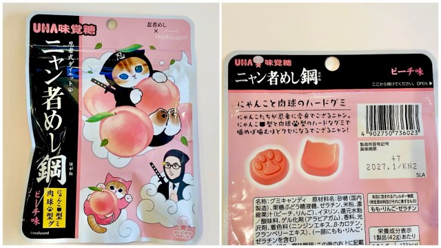 ピーチ味のグミは、にゃんこ型と肉球型の2種類です。忍者めし鋼らしい薄めのフォルムで、見た目もシンプルイズベスト!