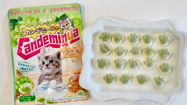 上の層はカンデミーナらしいガッチリハード食感、下の層はもっちりな2層食感になっていました。文句なしのかみごたえに、「ニャインマスキャットソーダ味」が甘さ控えめでパクパク進んじゃいますよー!