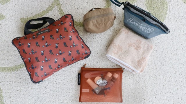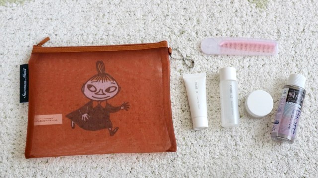 まずはメッシュポーチに、旅行用の化粧水や乳液などのスキンケアアイテムを入れてみます。