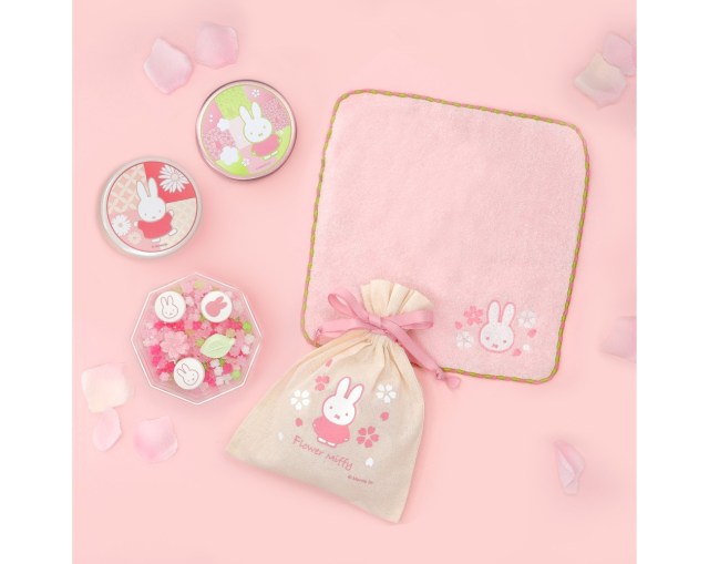 価格:Flower Miffy はないろらむね・金平糖 さくら 1998円、Flower Miffy 今治刺繍ミニタオル はなふぶき 1210円、Flower Miffy 缶入り緑茶 さくら/ほうじ茶 七宝 1944円