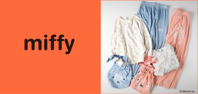 トップスは、ミッフィーの目と口のモチーフを総柄で表現し、胸元に目を閉じたミッフィーの刺繍をあしらった遊び心たっぷりのデザイン。ボトムや巾着にもミッフィーの顔が施されています♪ ふんわりと柔らかなベロア素材で着心地の良さも魅力。カラーは「オフホワイト×ブルー」「ライトグレー×ピンク」の2色展開。ライトオンのオンラインショップ、一部店舗で販売中です。