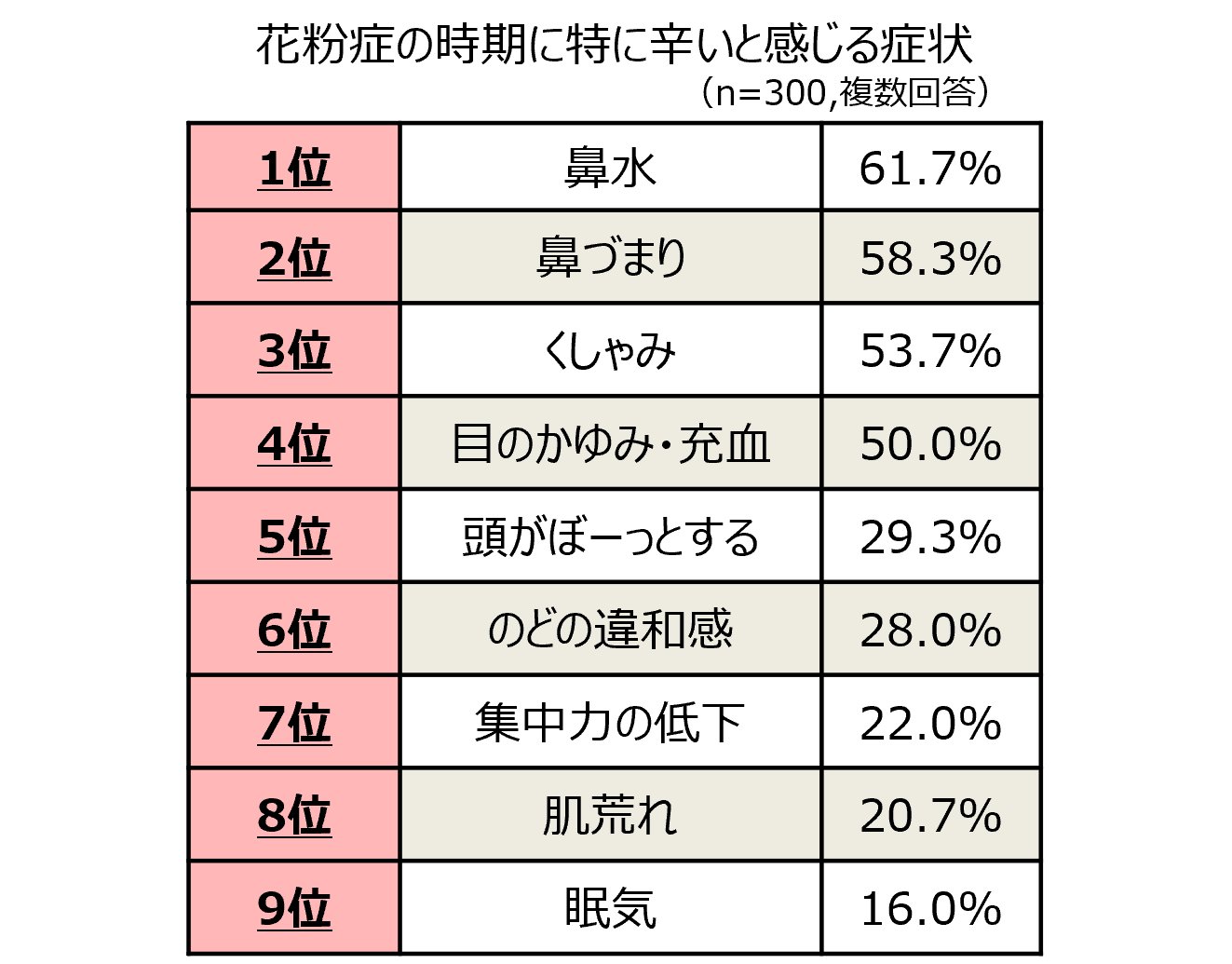 花粉症の症状は千差万別。クラシエ薬品株式会社が20代~40代の花粉症に悩む男女300名を対象におこなった調査によると、花粉症の人の半数以上が「鼻水」「鼻づまり」「くしゃみ」といった症状に悩んでいることがわかりました。