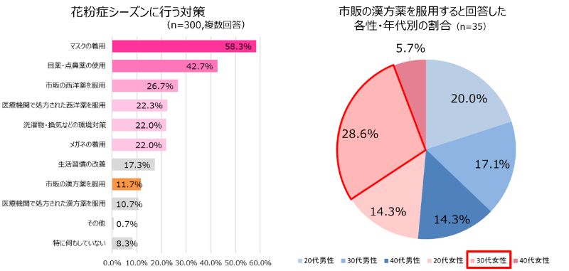 対策としては「マスクの着用」(58.3%)や「目薬・点鼻薬の使用」(42.7%)が主流となり、眠気を気にする女性たちのあいだでは「市販の漢方薬を服用する」(11.7%)という意見も見られたといいます。