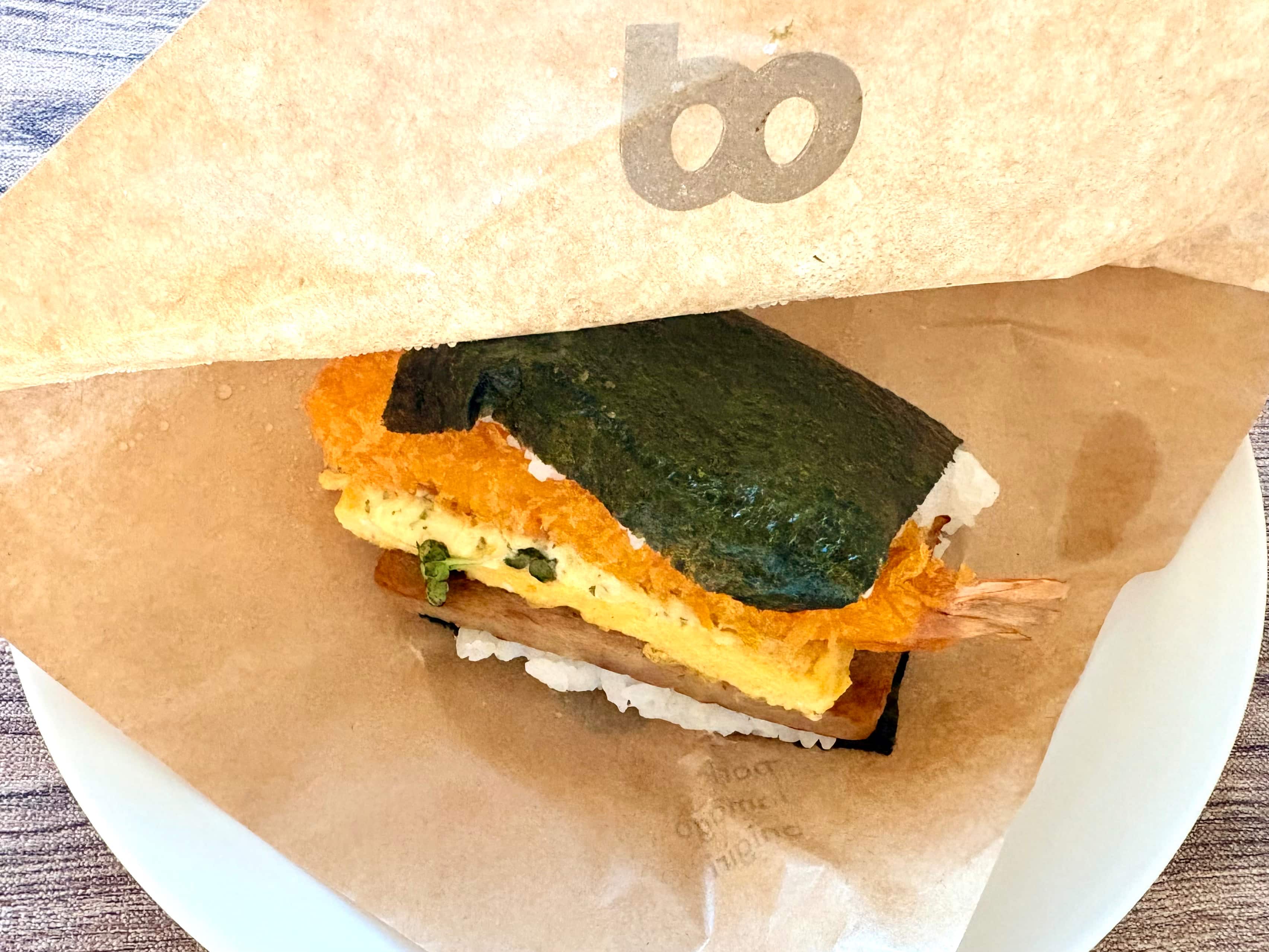 こちらは、のりやごはんの間にポークランチョンミートとたまごのほか、サクッとしたエビフライとタルタルソースがサンドしてある贅沢なひと品。大きな口でパクッと頬張れば、口の中が圧倒的なご馳走感に包まれます。