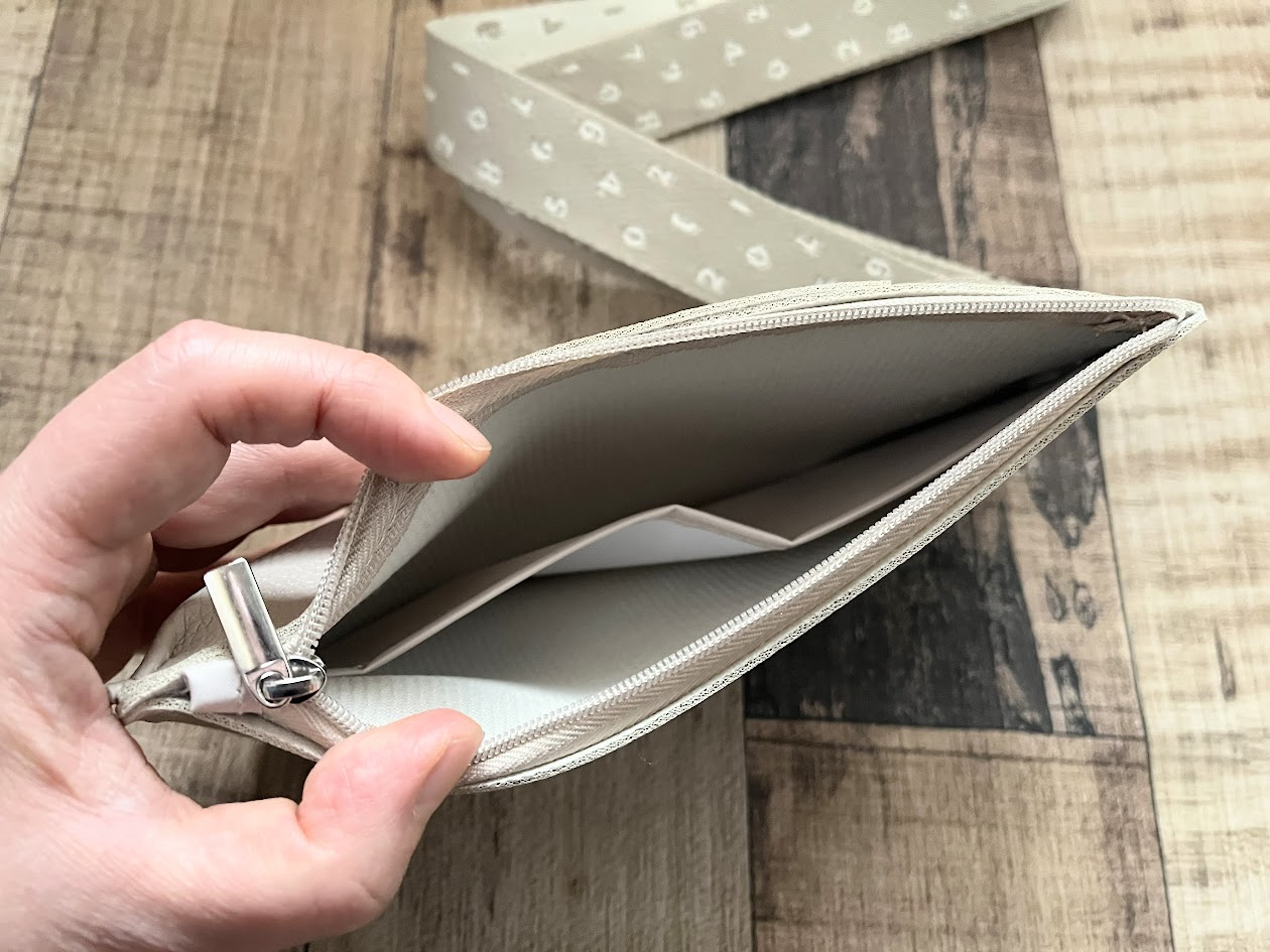 高級感あるグレージュ×レザー調のスマホポシェットで、サイドファスナーを開けると収納スペースがお目見え。収納スペースにはポケットもついており、カード・小銭・レシートなどを整理できちゃうの!
