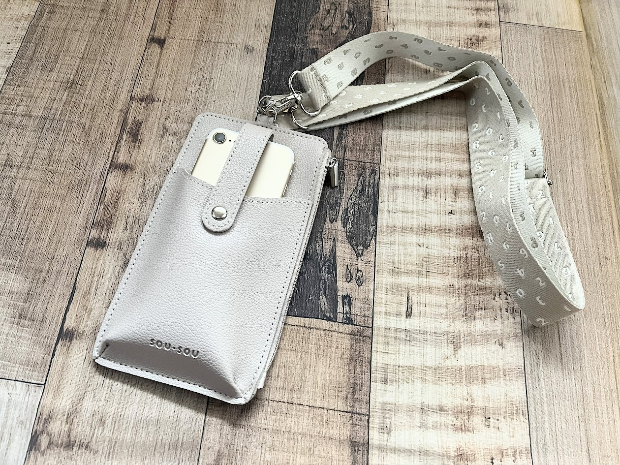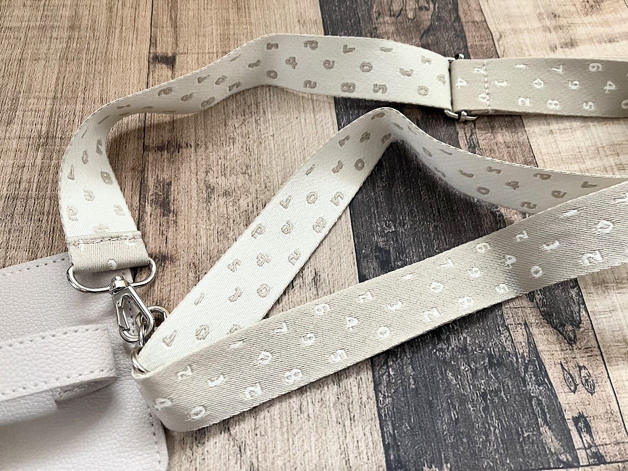 スマホポシェットのストラップは幅広タイプで、数字柄(SO-SU-Uのモチーフ)がデザインされています。