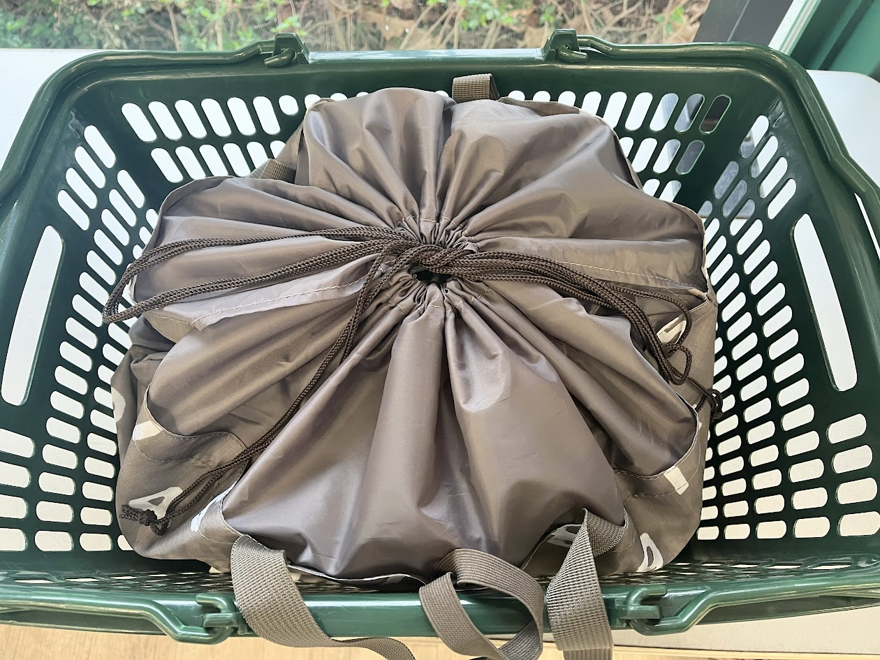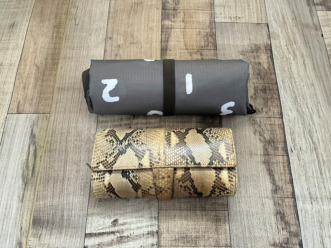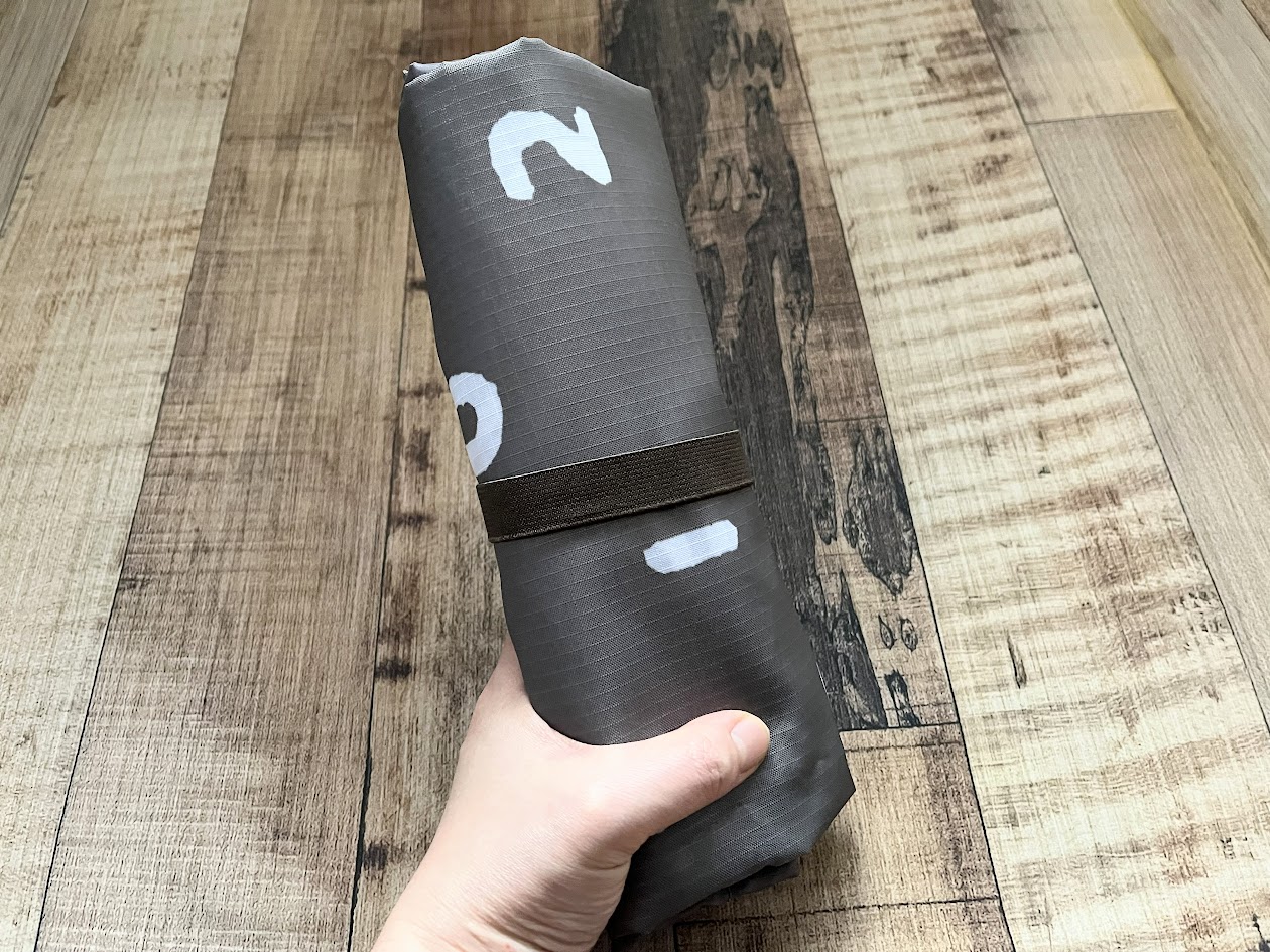 バッグにはゴムバンドがついており、くるくるっと丸めるとコンパクトになります。とはいえ、コンパクトになってもまあまあサイズがデカい(笑)。