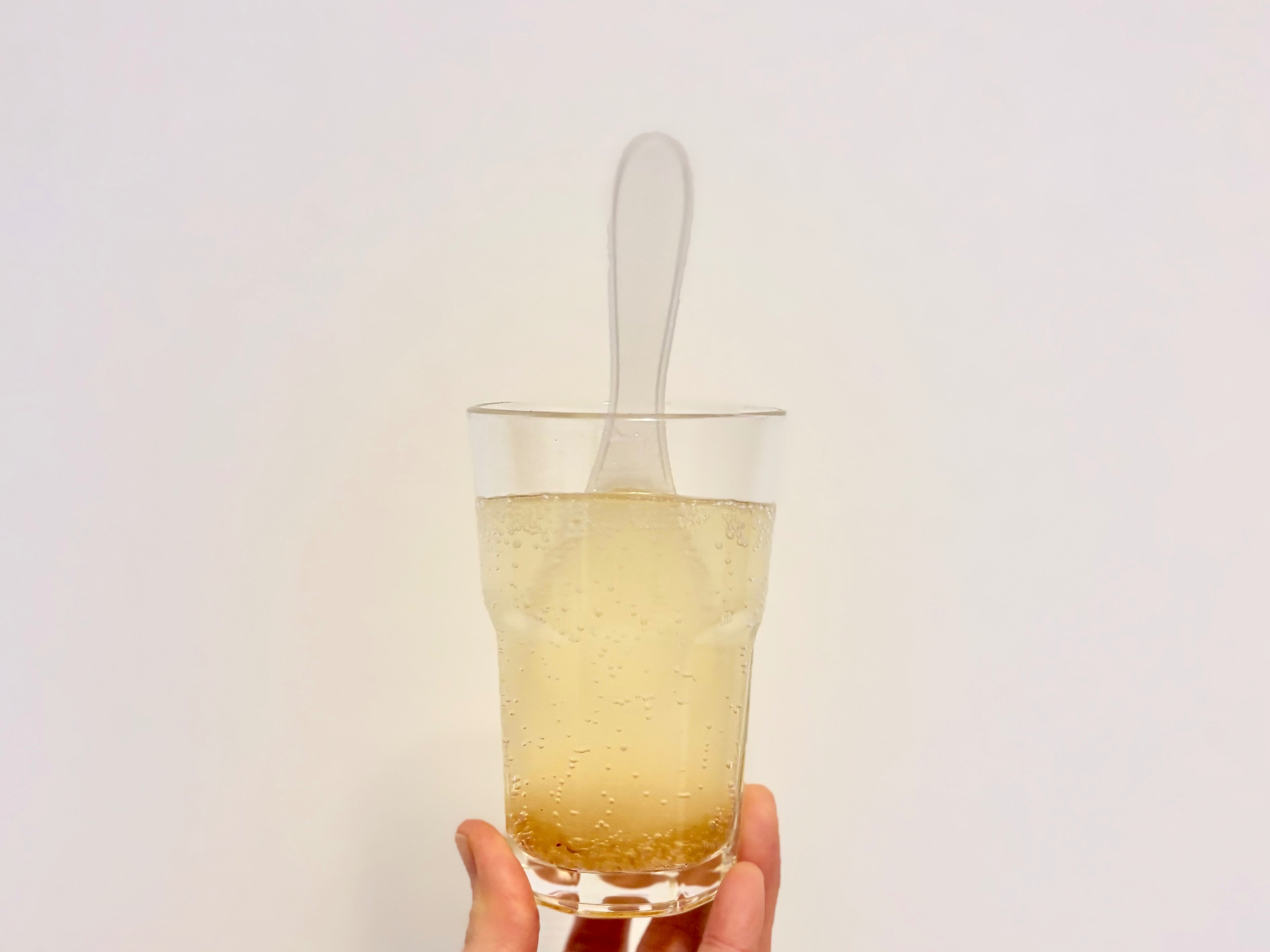また、お湯のほかに水でも割れるというので、お次は炭酸水と合わせてみましたよ。ポーションはサラサラしているので、たしかに冷たいものに入れてもきれいに溶けてくれました。