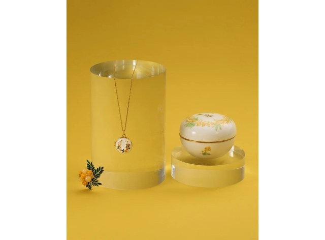 職人が1点1点、丁寧に色付けをして仕上げたミモザのネックレス、ブローチに、それぞれノリタケのボンボニエール(ふた付きの小箱)が付いたセットが販売中です。