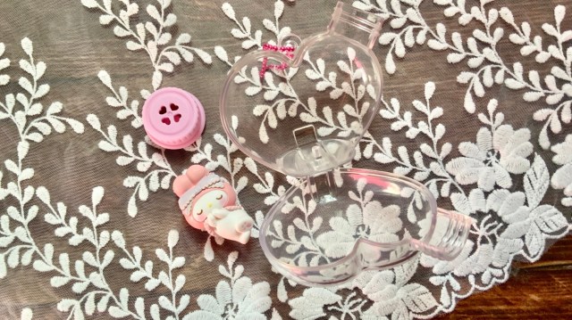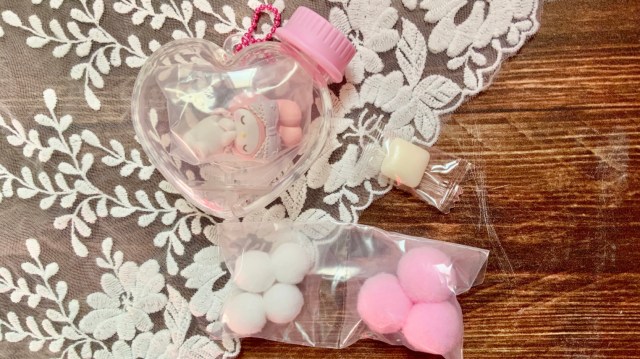 「キャラもふケースマスコット サンリオキャラクターズ」は、ハートの瓶型ケースに入ったかわいいマスコットチャーム。箱の中には以下のものが入っていました。