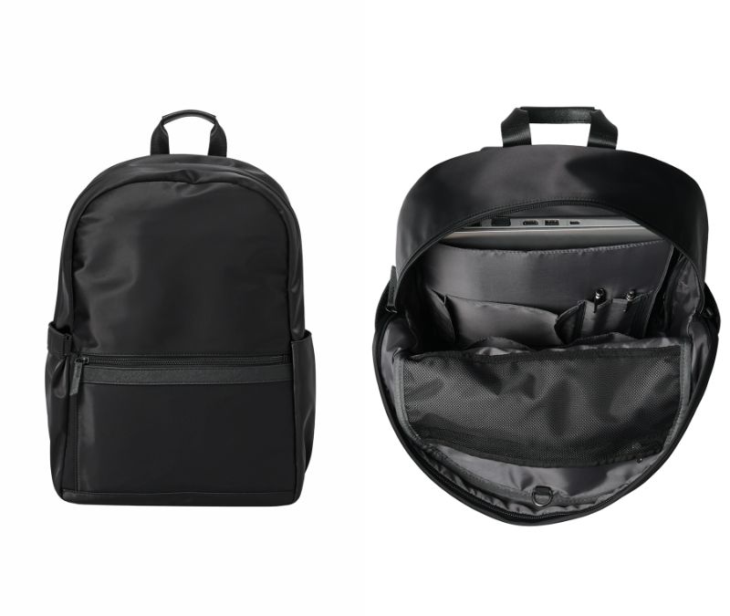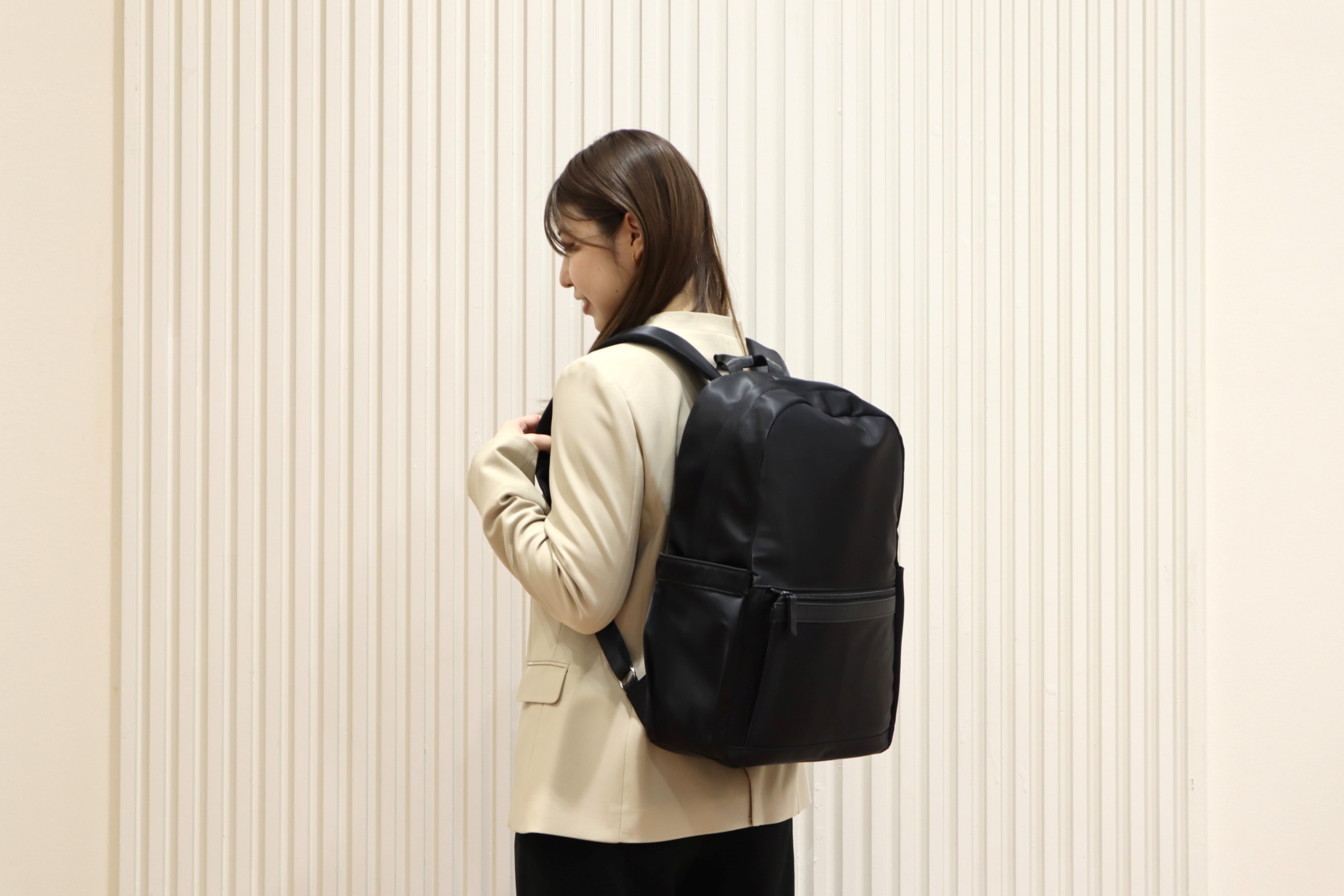 奇をてらったところは一切なく、パッと見た印象は「ごく普通のリュック」という感じ。スーツをはじめとする “きちんとした服装” にも合いそうな、無地×オールブラックで仕上げたシンプルなデザインです。
