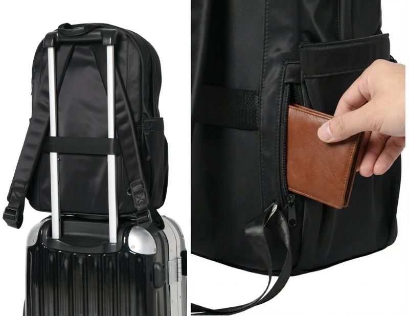 ・PCを持ち運べる「クッション付きポケット」や背負ったまま財布などを取り出せる「背面ポケット」付き