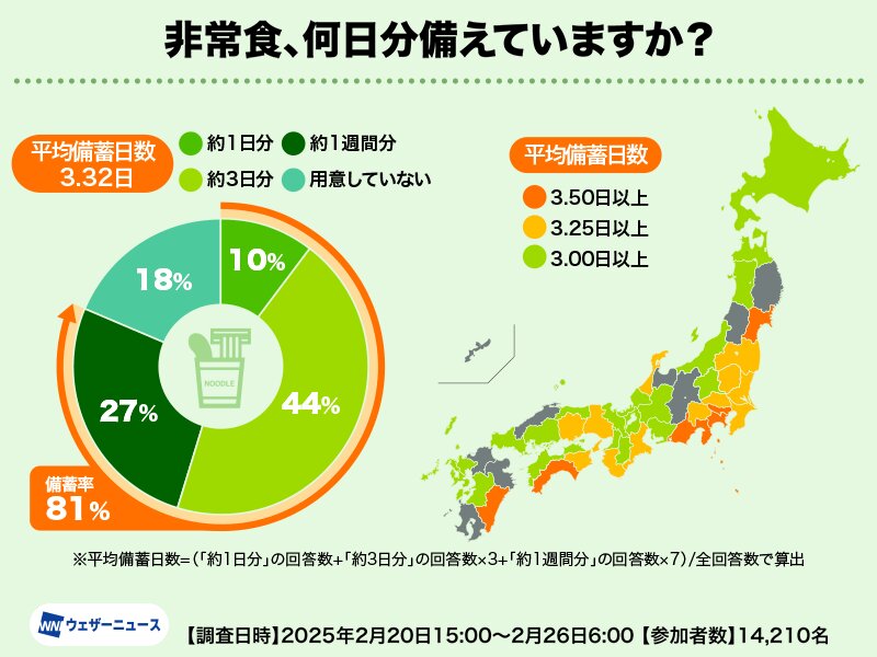 地震や災害が多い日本。それゆえに巷の人々の意識も高いようで、ウェザーニュースの調査では約8割が「非常食を備蓄している」ことが明らかになっています。