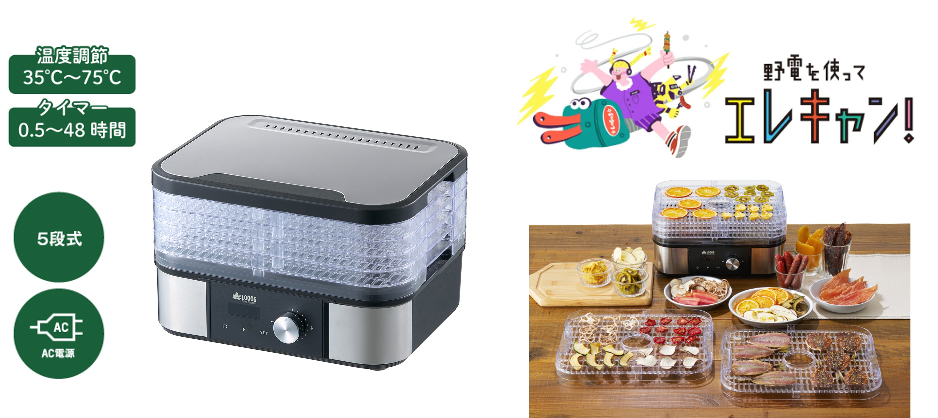 キャンプでも本格的に干物がつくれちゃうフードドライヤー。食材を切ってトレーに並べるだけで、干物はもちろん、ドライフルーツや乾燥野菜、ビーフジャーキーなどをつくることができます。