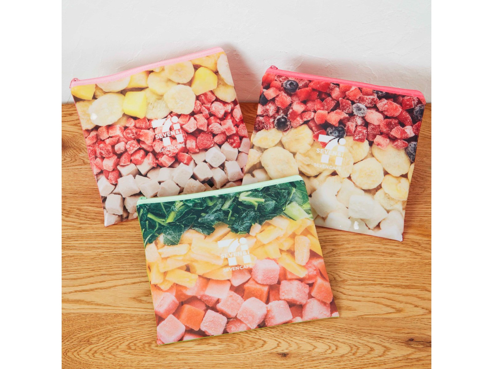 いまやセブン-イレブンの名物商品となっている「セブンカフェ スムージー」をリアルに再現したポーチ。前面にはフレッシュなフルーツ、裏面には撹拌(かくはん)されてスムージーになった様子をデザインしています。
