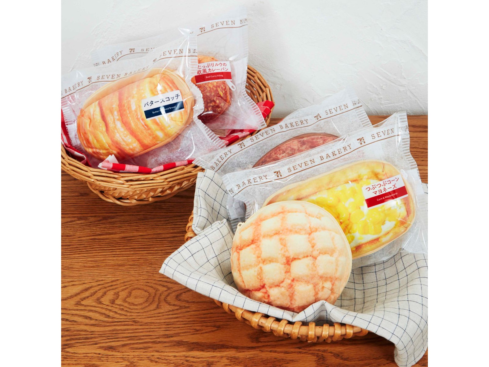セブン-イレブンのパンっておいしいですよねぇ。こちらは人気の「メロンパン」や「カレーパン」をモチーフにしたふわふわポーチです。包装袋までチャック付きのクリアポーチになっていて、1点で2つのポーチが手に入ります。