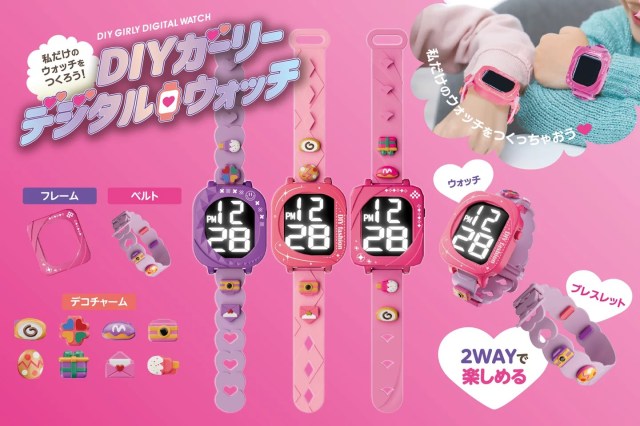DIYで自分だけの “かわいい”を作れるアクセサリー感覚のデジタルウォッチ。本体にフレームやベルト、デコチャームといったパーツを自由に組み合わせて、ウォッチとブレスレット2WAYで楽しめますっ♪