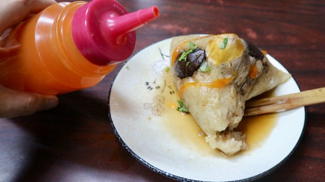 ちまきは、ひと目で具だくさんだとわかる、ずっしりとしたフォルムです。現地の友人によると、テーブルに置いてあるオレンジ色の甘辛ダレをかけて食べるのがおすすめなのだそう。
