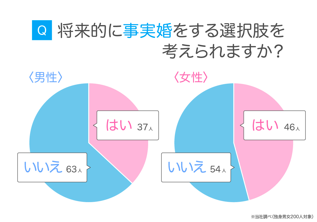 マッチングアプリ「ハッピーメール」が独身男女200人を対象におこなった調査によると、男女ともおよそ4割が「将来的に事実婚をすることも考えられる」と回答しており、女性のほうがやや数が多い結果となりました。