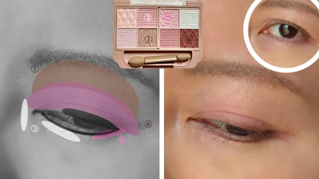 淡いベージュとピンクを重ね、ピンクのラメを目頭側にのせてピンクが主役のアイメイクに。腫れぼったい印象になるのを防ぐため、濃いブラウンをアイライナー代わりに細く入れています。