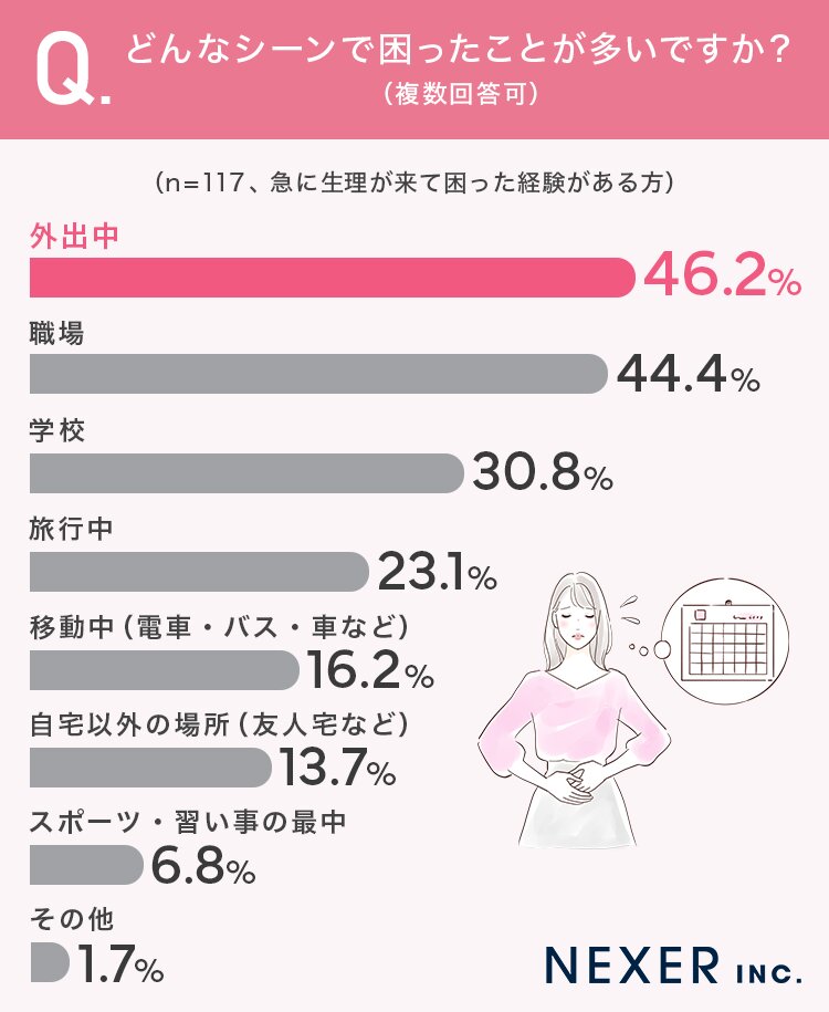 全国の女性200名を対象に株式会社NEXERとAngelite(アンジェライト)がおこなった調査によると、58.5%が「急に生理が来て困った経験がある」と回答。また「どんなシーンで困ったことが多いか」聞いてみたところ、もっとも多かったのが「外出中」(46.2%)でした。2位~5位までの結果はこちら!