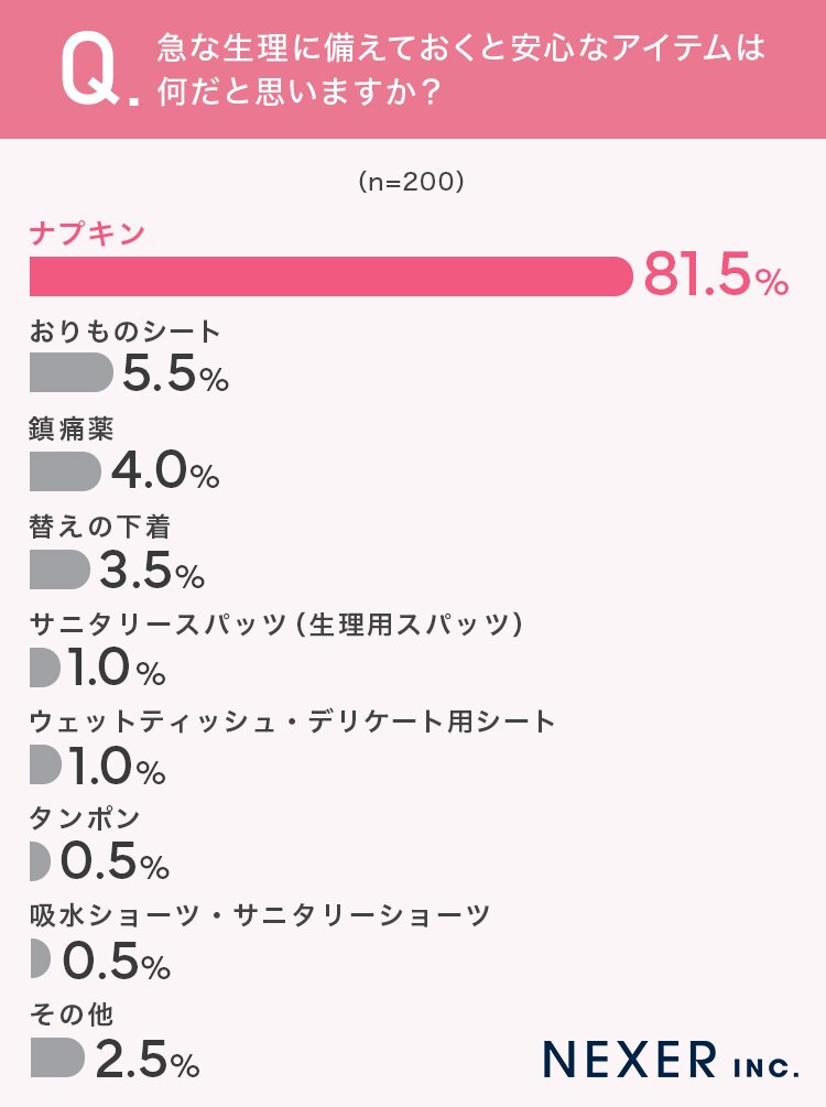 ちなみに、急な生理に備えておくと安心なアイテム1位は「ナプキン」(81.5%)でした。また、54.0%が「普段から生理用品を持ち歩いている」とも回答しています。