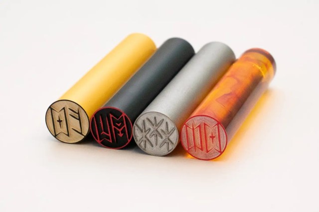 鋭い直線と幾何学的な模様がスタイリッシュ! 漢字のほかにひらがな、カタカナ、アルファベットにも対応&材質は柘植、黒水牛、チタン、ナツメなどから選べます。