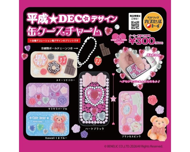 平成をほうふつとさせる、グリッターやデコパーツのデコレーション風デザインをプリントした缶ケース。ラインナップは、ドーナツやチョコレートがあしらわれた「スイーツイエロー」、ラインストーンを敷き詰めた「ハートブラック」など全5種類。