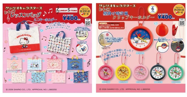 「レトロレッスンバッグミニキーホルダー」は、ノスタルジック感ただようキルティング生地のレッスンバッグをそのままミニチュア化。「ハローキティ」「リトルツインスターズ」「ポチャッコ」「マロンクリーム」「サンリオキャラクターズ」の全5種類がそろいます。