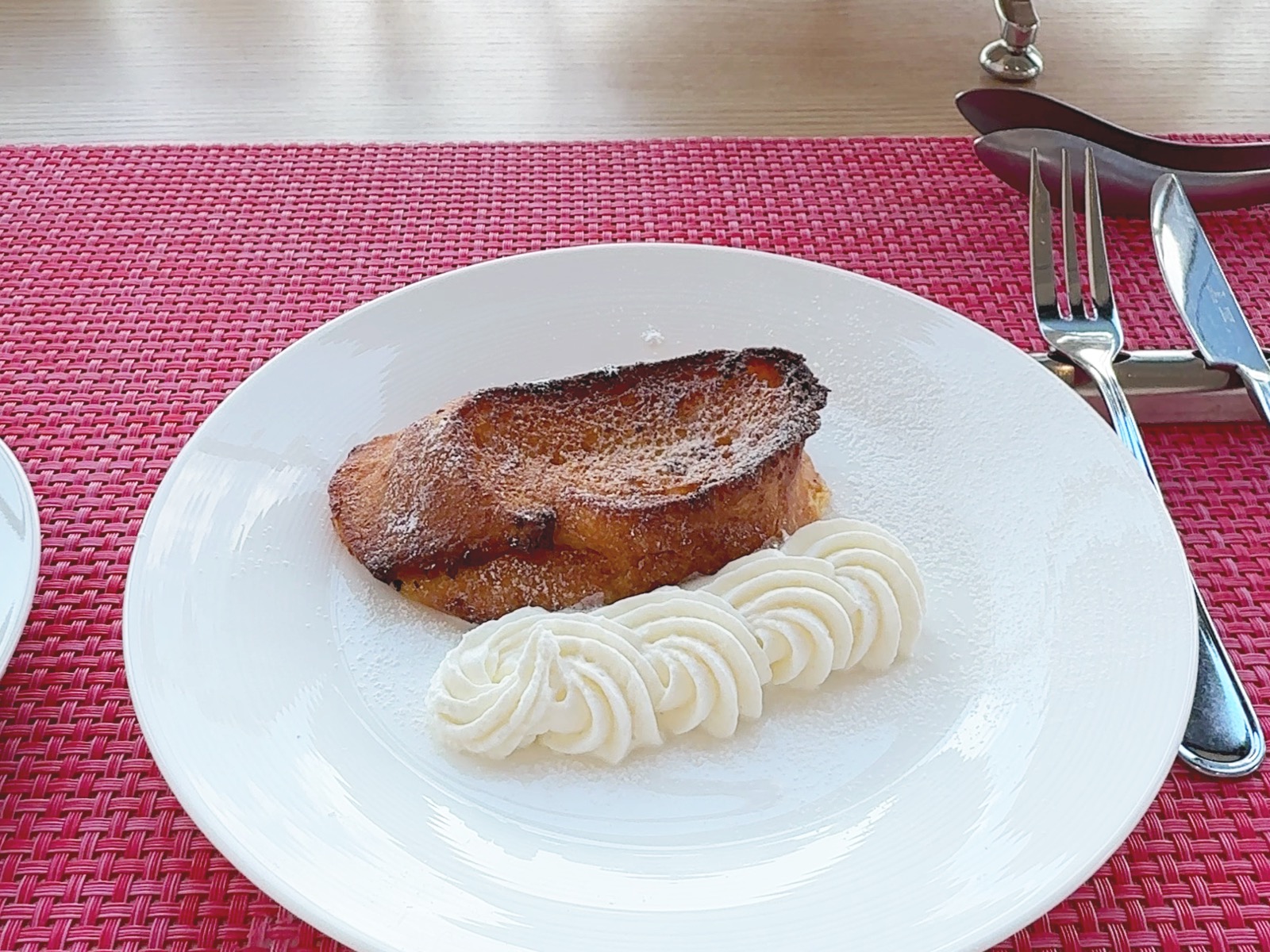 まずはアツアツで提供されるフレンチトーストから。ホテルのフレンチトーストってなんでこんなに美味しいんでしょうか? ホワッホワです。
