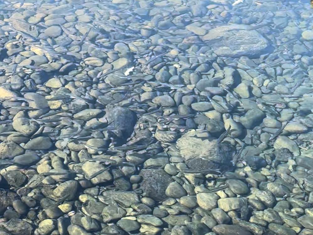 集まって泳いでいる姿がくっきりと見える、クリアな水辺です。