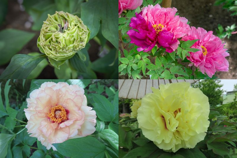 赤やピンクといった定番色のほか、希少品種もラインナップ。中国品種×日本品種の自然交配による緑色のぼたん「まりも」、黄色の千重咲き品種「ジパング」、黄色に桃色がかった「赤銅の輝(しゃくどうのかがやき)」などを楽しめます。なお苑内では、ぼたんのほか、約20品種のシャクヤクやシャクナゲを堪能することも◎。