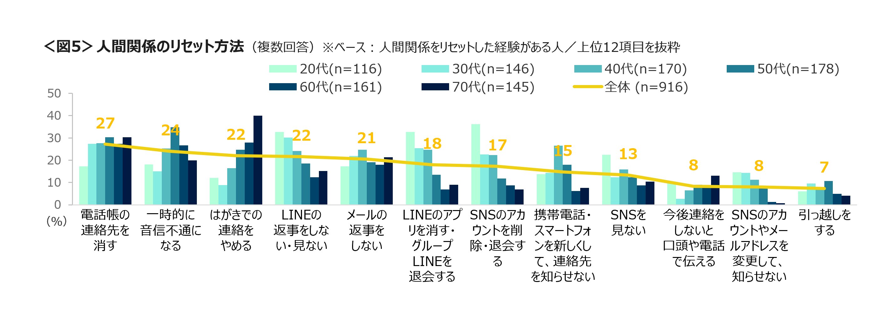 ちなみに、人間関係リセットした方法として多く挙げられたのは「電話帳の連絡先を消す」「一時的に音信不通になる」「LINEアプリを消す・グループLINEを退会」「SNSアカウントの削除」「引越しをする」など。