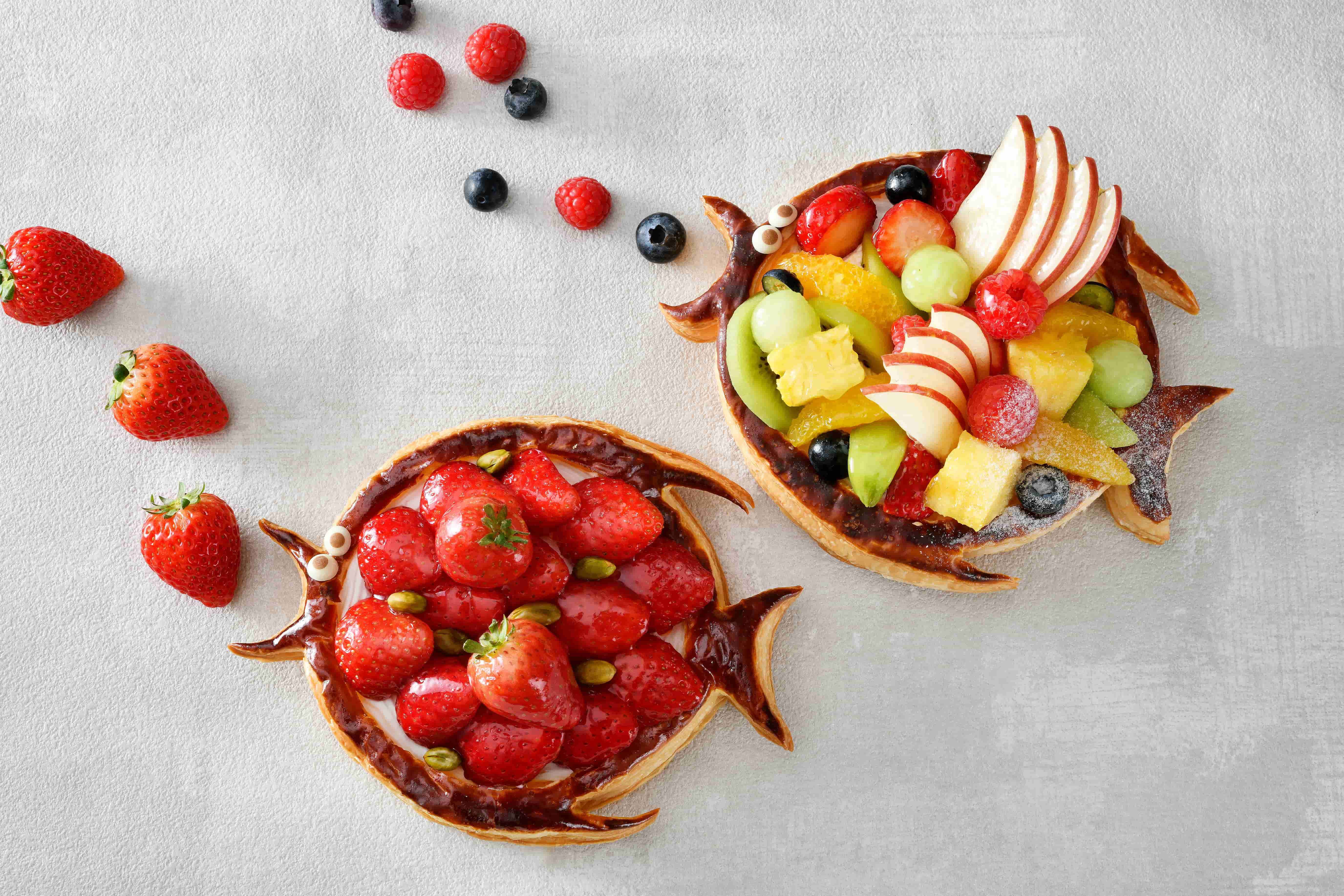 おどけた表情の魚がかわいらしいパイを2種類ラインナップ。旬のいちごをたっぷり飾った「ポワソンダブリル(苺)」では、フレッシュないちご×やさしい甘さのカスタードクリームによるマリアージュを楽しめちゃう!