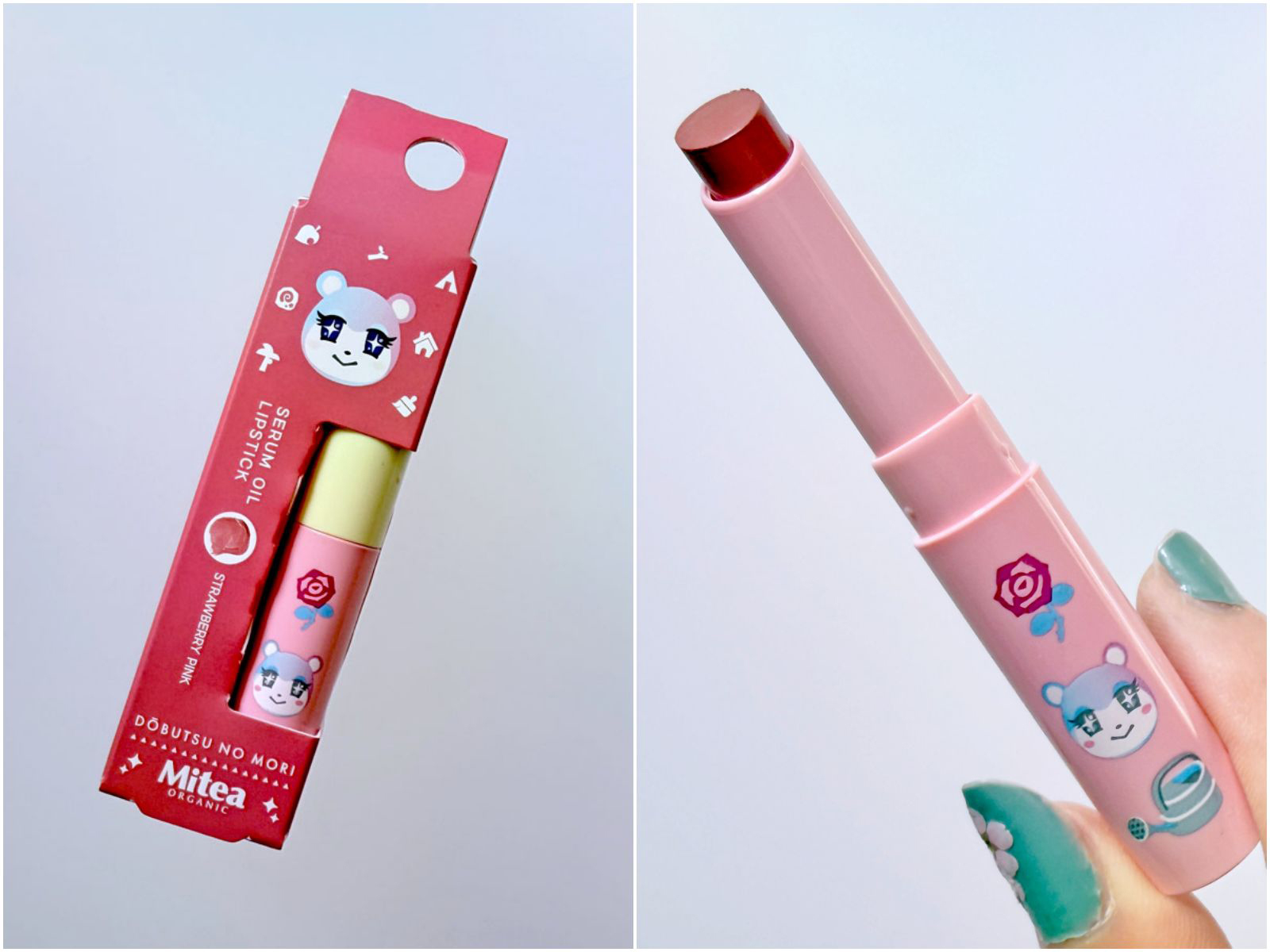 そして、全6色展開で販売されるのが「<どうぶつの森>ミティア セラムオイルリップスティック」(995円)。編集部にはみすずパッケージの「ストロベリーピンク」が届きましたが、ほかにもしずえさん、スピカ、ミッチェル、ゆきみ、ジャックが登場しています。