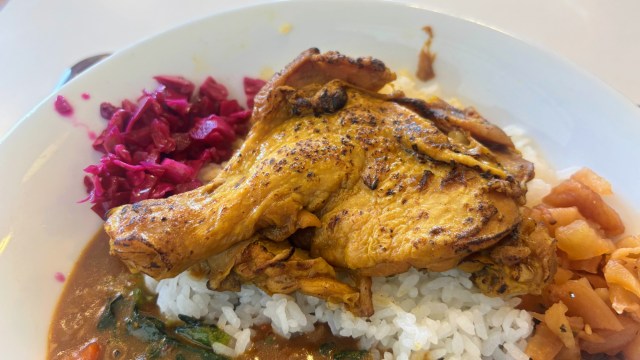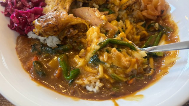 カレーは果実と野菜が溶け込んだ優しい甘さ。マイルドな味わいなので、ほうれん草のほろ苦さや炭火焼チキンの香ばしさをより引き立ててくれます。