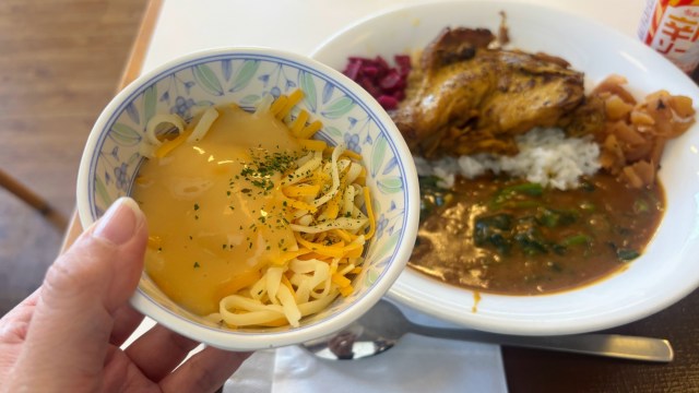 このほか、「炭火焼きほろほろチキンカレー」(並盛 850円)、「チーズほろほろチキンカレー」(並盛 1050円)、「おんたまほうれん草ほろほろチキンカレー」(並盛 1060円)もメニューにありますが、個人的には、「ほうれん草ほろほろチキンカレー」に「とろ~り3種のチーズ」トッピングがいちばん好きかも♡