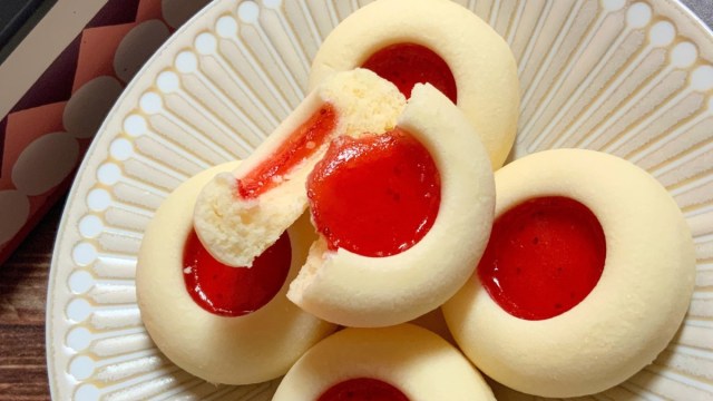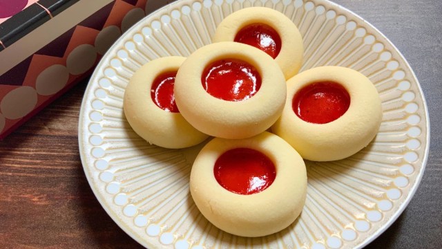 卵を使っていないバターたっぷりのクッキー生地は全くパサパサ感がなく、しっとりほろほろの優しい食感。噛むたびに甘酸っぱいジャムと溶け合って、とってもおいしいです♡