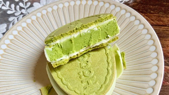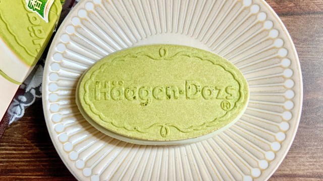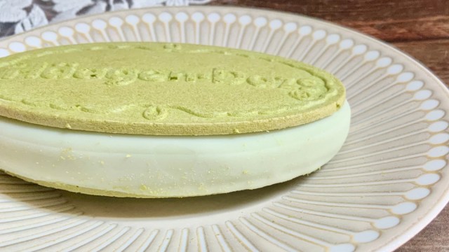 中に隠れているのは、もちろん濃厚な抹茶アイスクリーム。国産の抹茶を使用し、クリスピーサンドオリジナルの配合で仕上げているんだとか。抹茶のほろ苦さと香りがしっかり感じられる、さすがハーゲンダッツなおいしさです。