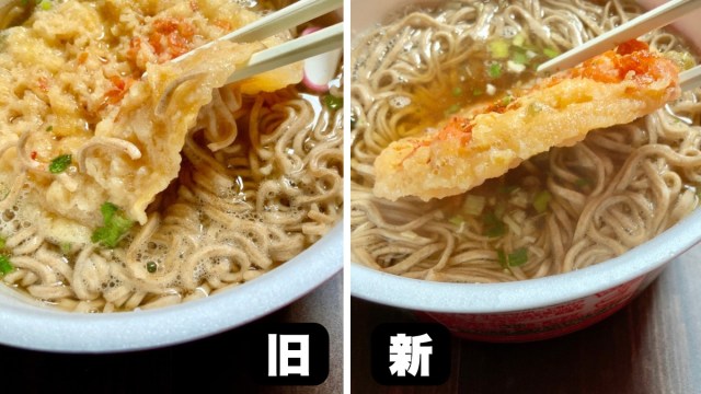 旧かきあげは “さきいれ” なのでおつゆが染みてやわやわ。どちらがおいしいかは好みによって意見が分かれそうですが、サクサク感が楽しめる “あとのせ” は食感のアクセントにもなってやっぱりおいしい!