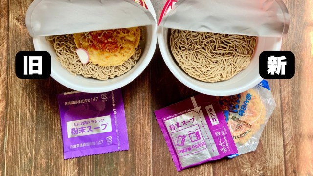 今回食べ比べてみたのは「日清のどん兵衛 きつねうどん」(東日本向け) と「日清のどん兵衛 天ぷらそば」。50年前の味を再現した「クラシック」の方は、パッケージもどこか懐かしさを感じられるデザインです。