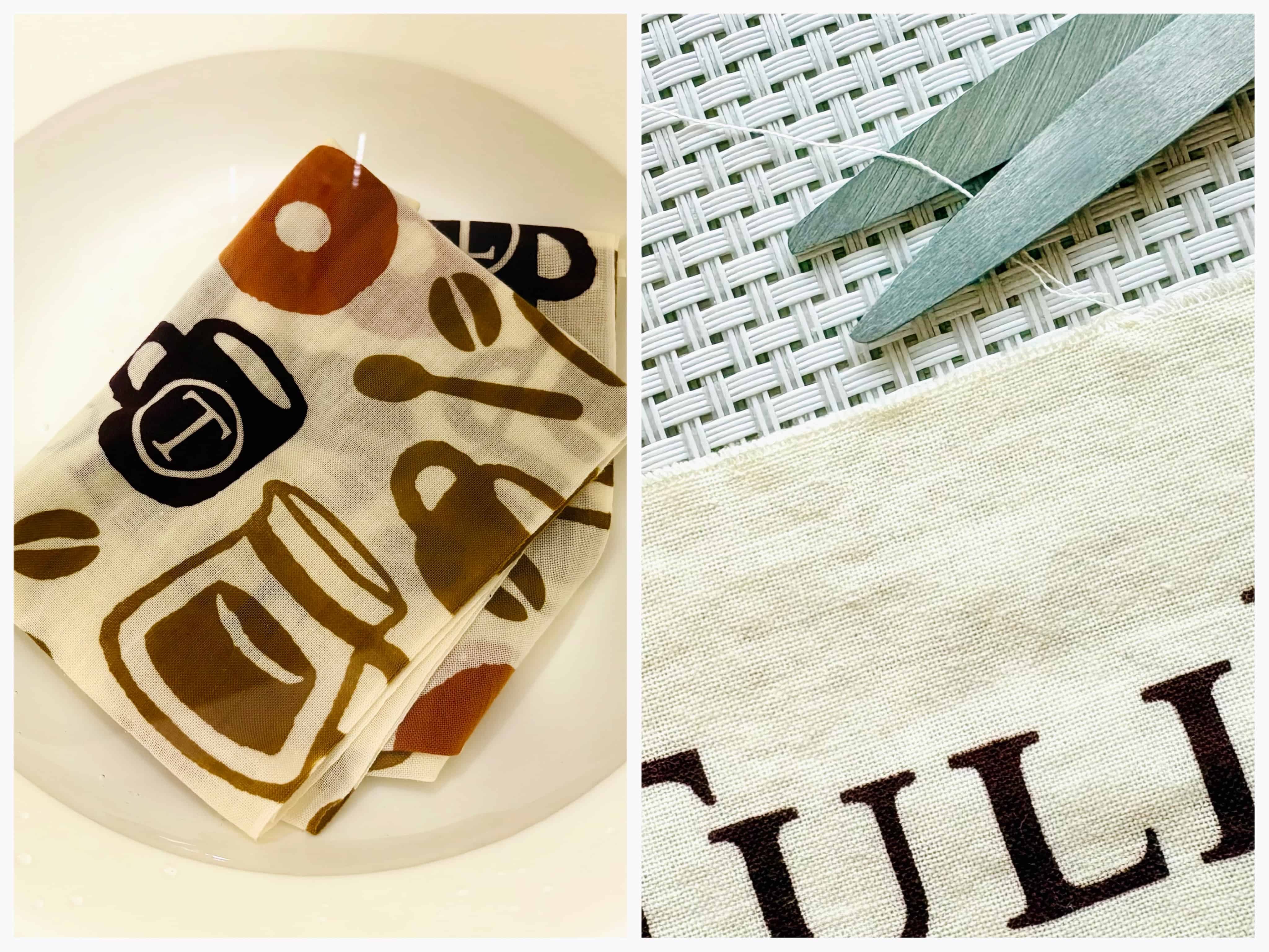 手ぬぐいは生地が切りっぱなしなので、洗って乾かしたあとは端がほつれます。はじめのうちはワサワサとほつれが出て驚きますが、ハサミでカットすればOK!