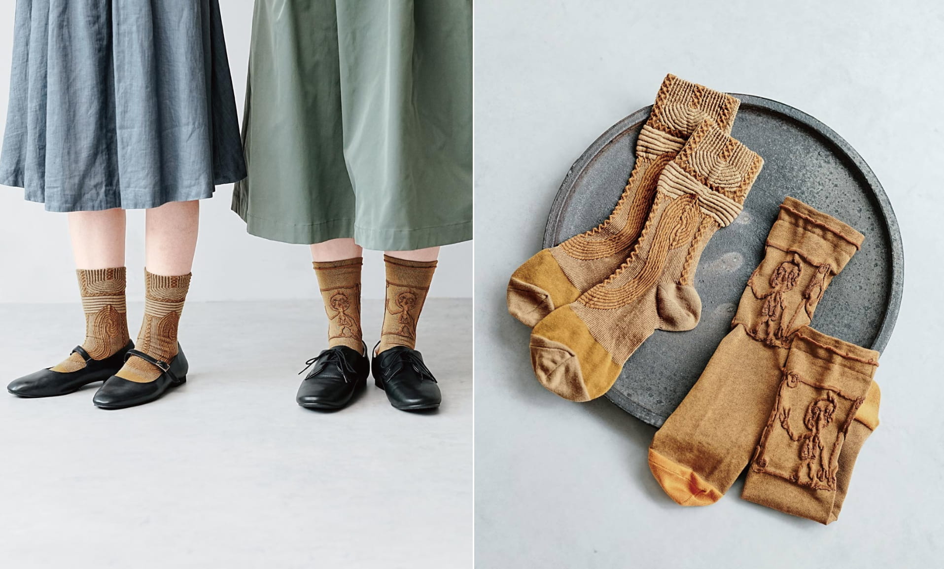 縄文土器の文様のデザインをジャカード編みで表現したソックス。高さのある鉢状の土器「深鉢形土器(ふかばちがたどき)」と、土偶を表している珍しい土器「人体文様付有孔鍔付土器(じんたいもんようつきゆうこうつばつきどき / 愛称:ぴ~す)」をラインナップしています。